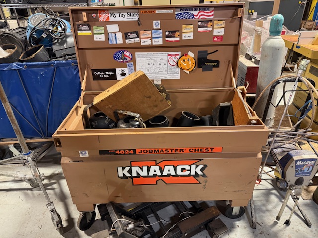 BILJAX SCAFFOLDING SYSTEM W/ FRAME AND PICKS, PALLET RACKING, KNAACK JOB 4824 JOB BOX, VINTAGE WOOD BURNING FIREPLACE, HAND TOOLS, POWER TOOLS, JANITORIAL SUPPLIES, EXERCISE EQUIPMENT, FLAME CABINET, WORK LIGHTS, CAR BATTERY CHARGERS, LIFTING STRAPS, ELECTRIC MOTORS, LADDERS AND MUCH MORE!