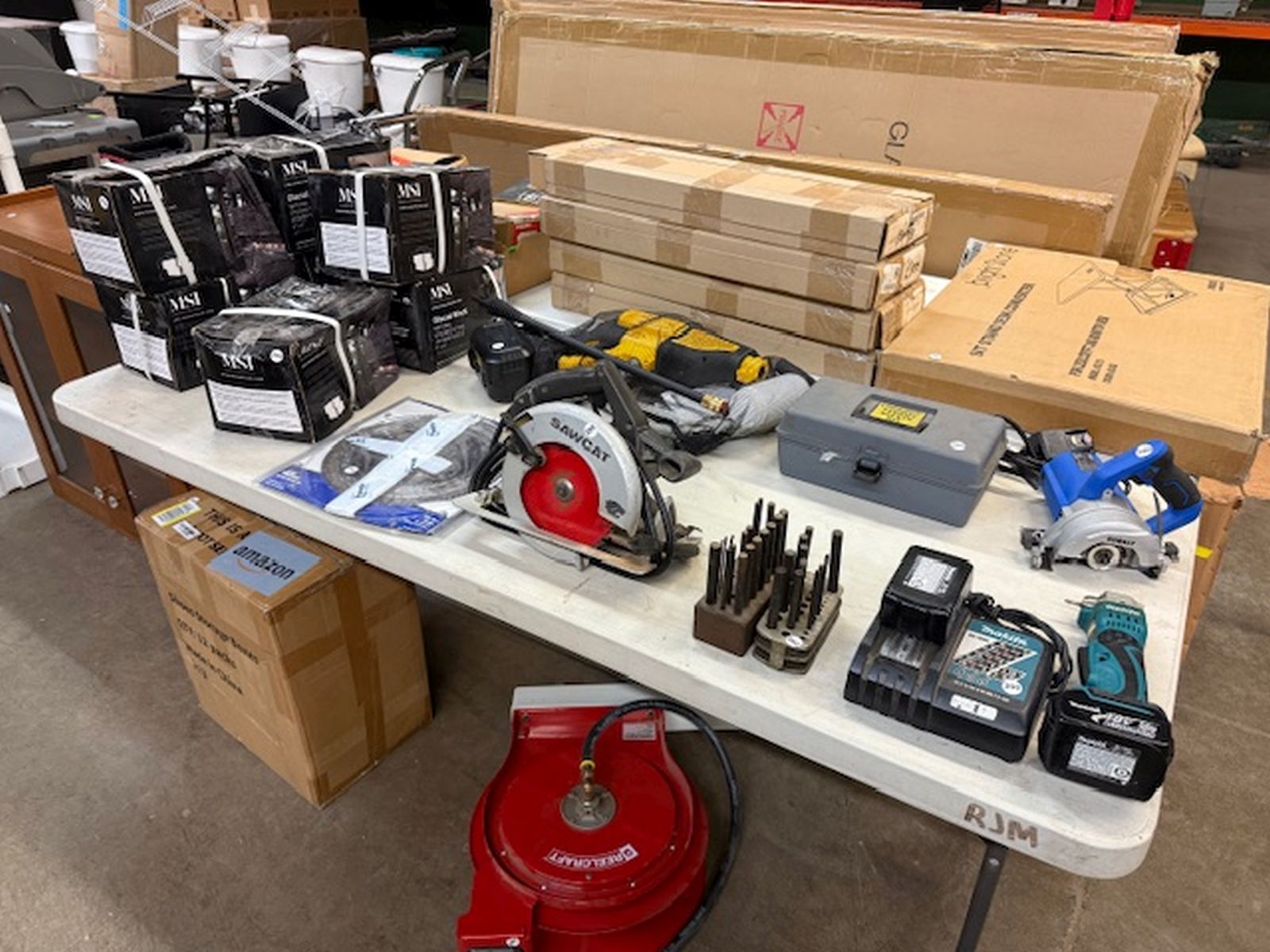 CRAFTSMAN TOOL BOXES, DEWALT TABLE TOP PLANER, SHOP VACUUMS, DRILL PRESS, DEWALT COMPOUND MITER SAW, POWER TOOLS, HAND TOOLS, LARGE QUANTITY OF T8 LIGHT BULBS, ELECTRIC MOTORS, SHOWER PANS & DOORS, LIFTMASTER COMMERCIAL GARAGE DOOR OPENERS, TABLE TOP SANDBLAST CABINET, DEWALT CORDLESS POWER WASHER, HUSKY PNEUMATIC FLOORING NAILER/STAPLER AND MUCH MORE!