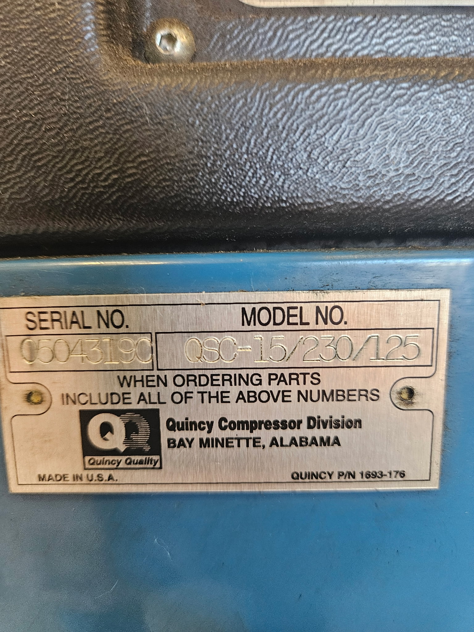 QUINCY QSC-15/230/125 AIR COMPRESSOR, S/N 05043190 (LOCATED OFFSITE IN MADISON HTS, MI)
